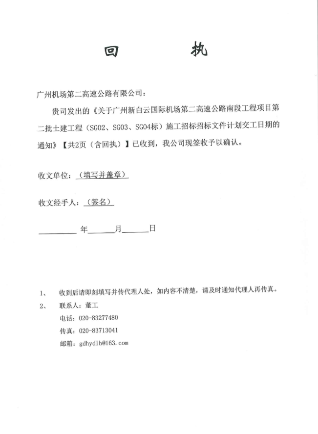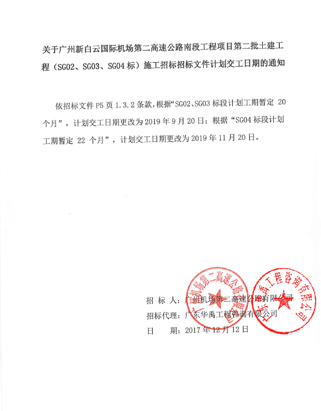 招标通知 -关于广州新白云国际机场第二高速公路南段工程项目第二批土建工程(SG02、SG03、SG04标)施工招标招标文件计划交工日期的通知