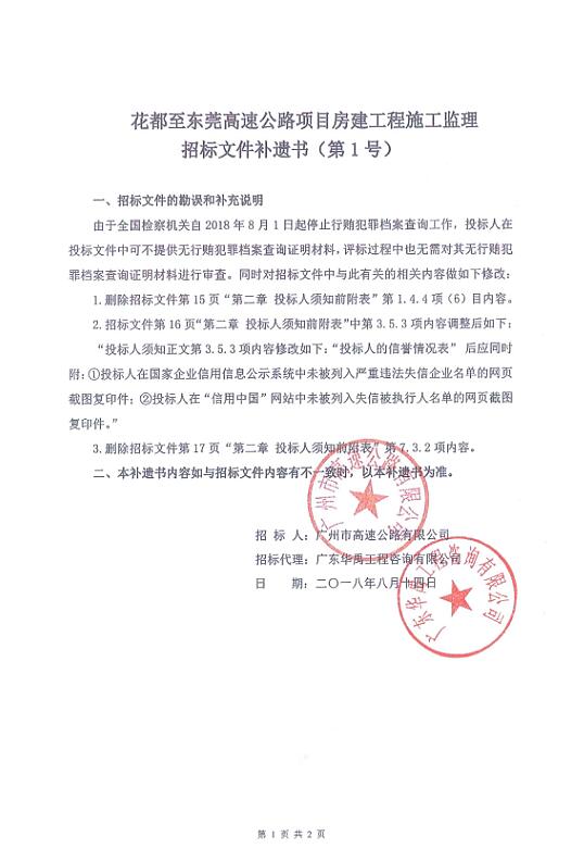 补遗书 - 花都至东莞高速公路项目房建工程施工监理招标文件补遗书(第一号)