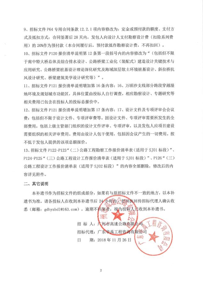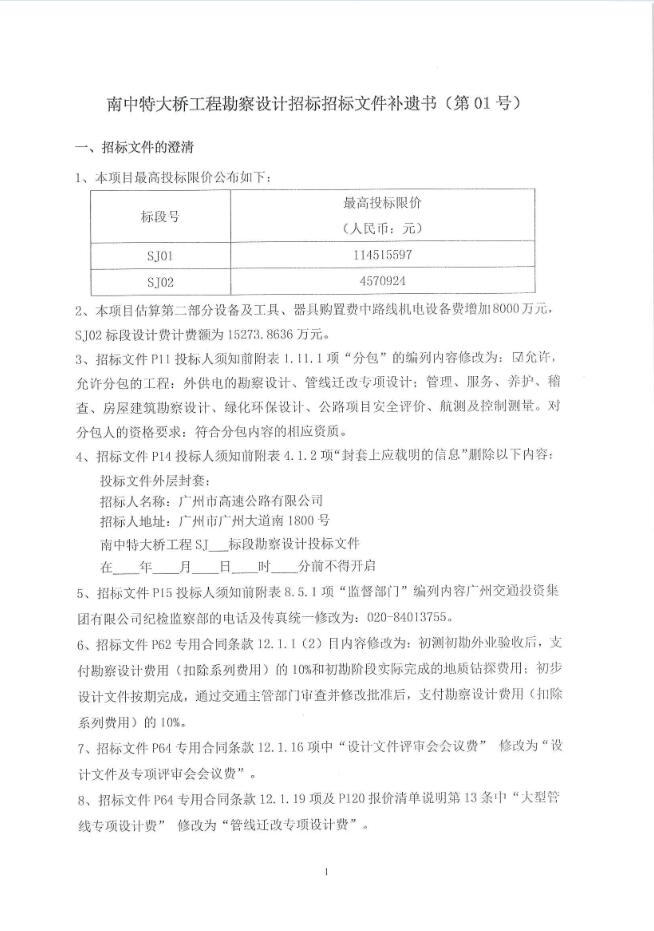 补遗书 - 南中特大桥工程勘察设计招标招标文件补遗书(第01号)