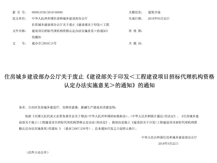 住房城乡建设部办公厅关于废止《建设部关于印发<工程建设项目招标代理机构资格认定办法实施意见>的通知》的通知