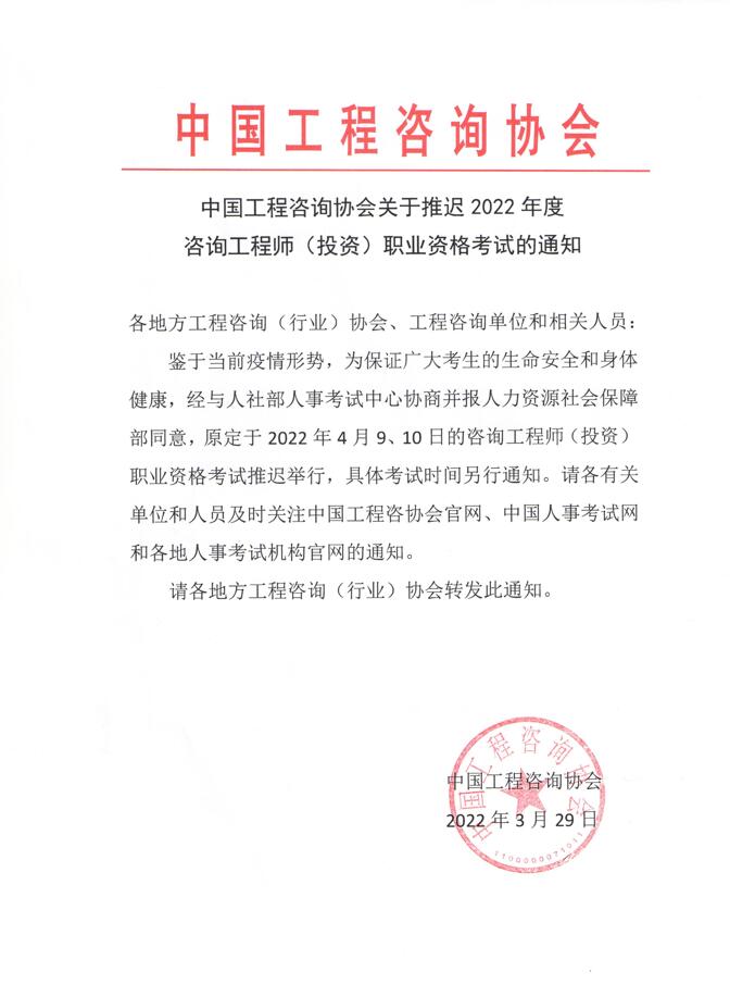【转】中国工程咨询协会关于推迟2022年度咨询工程师(投资)职业资格考试的通知